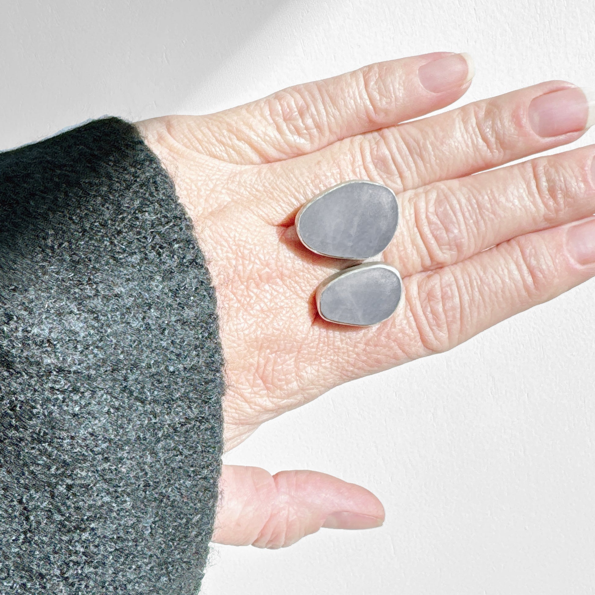 This handcrafted ring is crafted with two matte amazonite stones, each with its own organic shape and soft ocean color. The ring is set by hand in fine and sterling silver. No two stones are ever the same, which makes this piece as unique as the person wearing it.